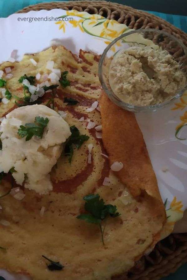 Pesarattu is a thin crepe made from green gram or yellow lentil. It is a popular breakfast from Andhra Pradesh. It is usually served with upma and chutney.